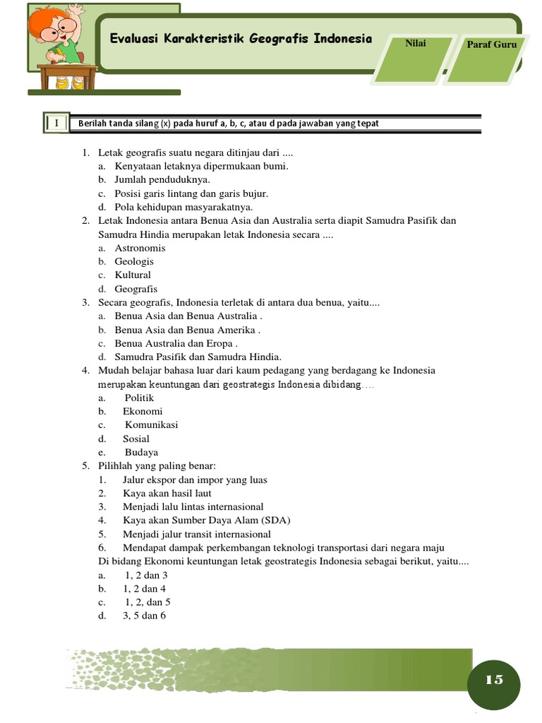 Soal IPS Kelas 6 SD Semester 1 Tentang Perubahan Wilayah Indonesia. Letak geografis menentukan letak posisi suatu daerah dengan daerah yang lain. Soal tentang kondisi fisik wilayah indonesia Jika kita membahas mengenai kondisi fisik wilayah indonesia maka tidak akan lepas dari dua hal yaitu permasalahan sosial yang berkaitan dengan pertumbuhan jumlah penduduk dan kondisi fisik wilayah dan penduduk indonesia.
