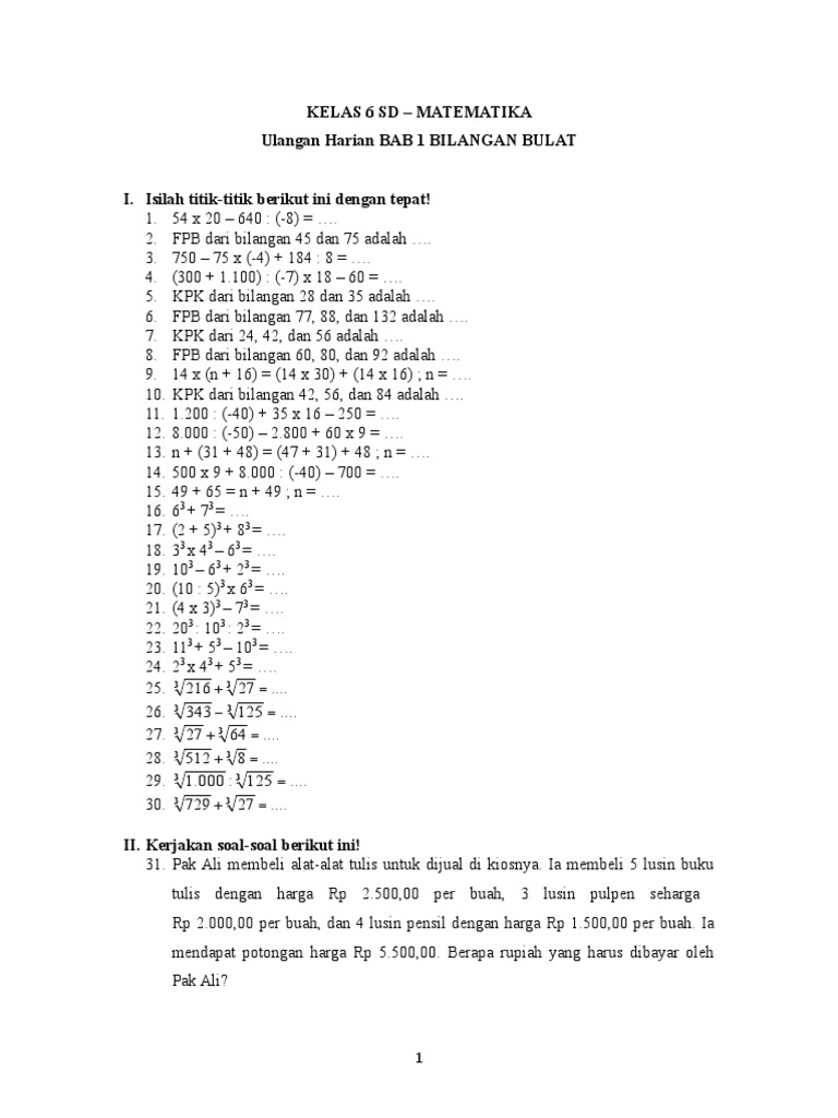 Contoh Latihan Soal Soal Ujian Mtk Semester 1 Kelas 6
